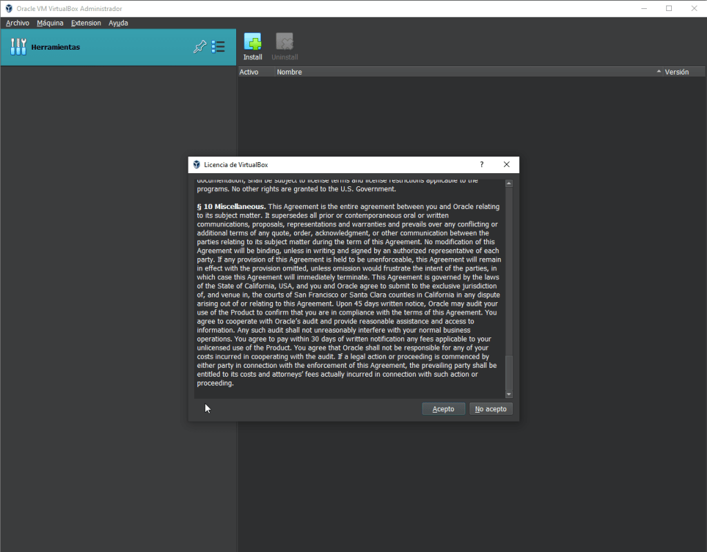- Espera a que aparezca el Oracle VM VirtualBox Extension Pack