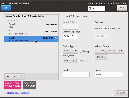 - Local Standar Disks: 100GiB ATA VBOX HARDDISK sda/100GiB free