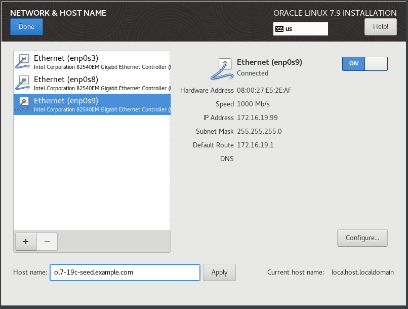 Dependiendo de las Direcciones MAC que haya asignado VBox, deberás configurar las interfaces de red en mi caso la 3 es la Nat, la 8 es Adapter (pública) y la 9 es Adapter #2 (privado)