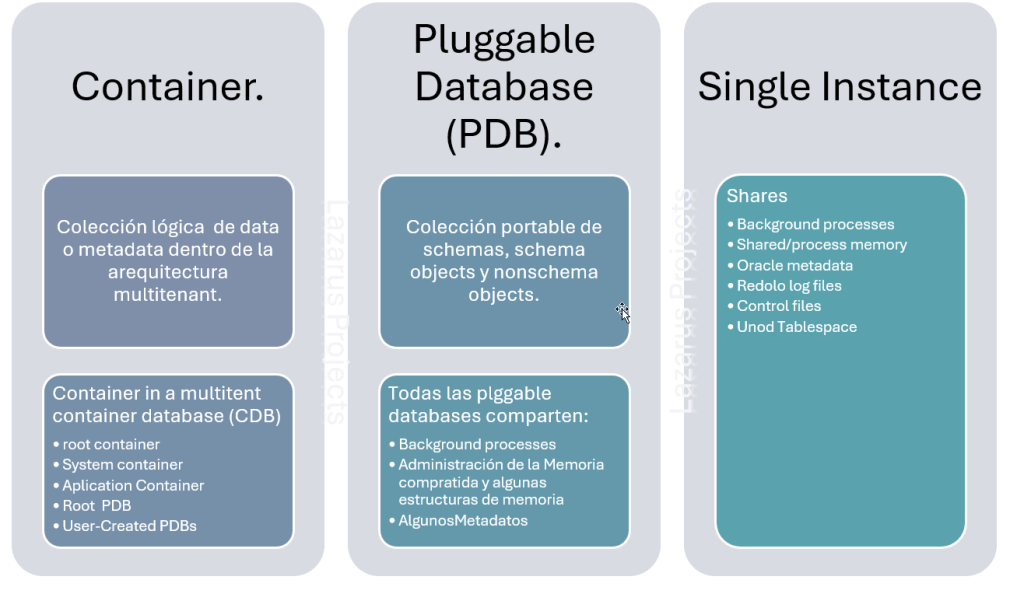 CDB$ROOT) y puede incluir múltiples bases de datos pluggable. - Características: