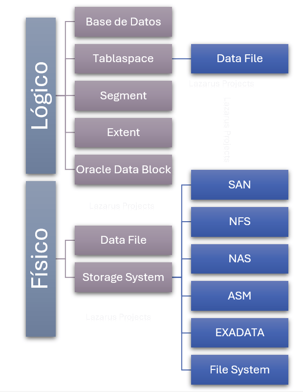 La arquitectura de almacenamiento de Oracle 19c tiene componentes clave para gestionar datos de manera eficiente. A continuación se presentan los elementos más importantes: