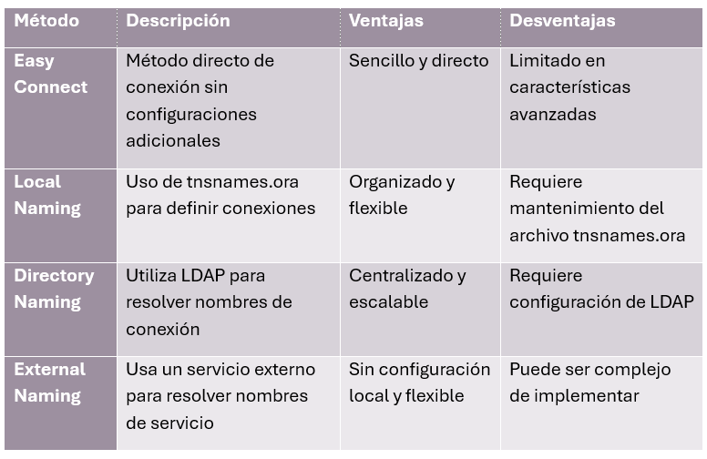 En Oracle, los métodos de nombrado se utilizan para resolver nombres de servicio en conexiones de bases de datos. A continuación, se describen los diferentes métodos de nombrado soportados en Oracle 19c: