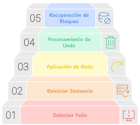 - Reinicio de la Instancia: Al reiniciar la instancia, Oracle realiza un chequeo y recupera el estado a través de tres pasos principales: Redo Application, Undo Processing y Block Recovery.