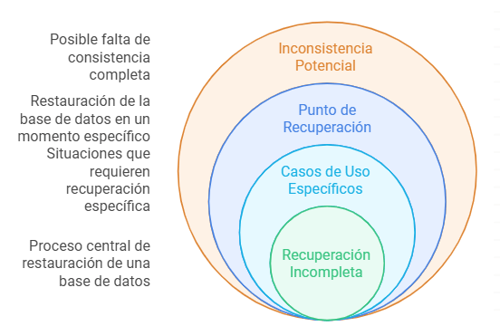 - No necesariamente Consistente: La base de datos puede no estar en un estado completamente consistente después de una recuperación incompleta, dependiendo del punto de recuperación seleccionado.