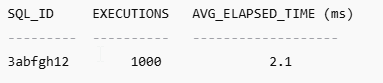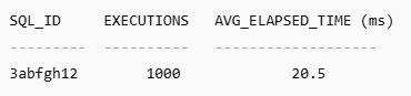 SELECT SQL_ID, EXECUTIONS, ELAPSED_TIME/EXECUTIONS AS AVG_ELAPSED_TIME