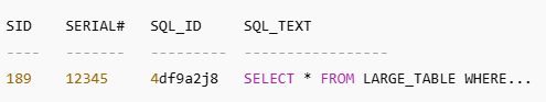 SELECT SID, SERIAL#, SQL_ID, SQL_TEXT