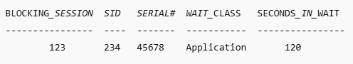 SELECT blocking_session, sid, serial#, wait_class, seconds_in_wait