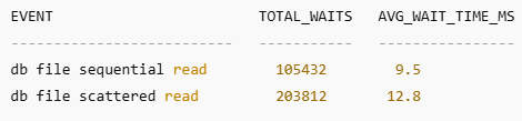 SELECT EVENT, TOTAL_WAITS, TIME_WAITED/100 AS AVG_WAIT_TIME_MS